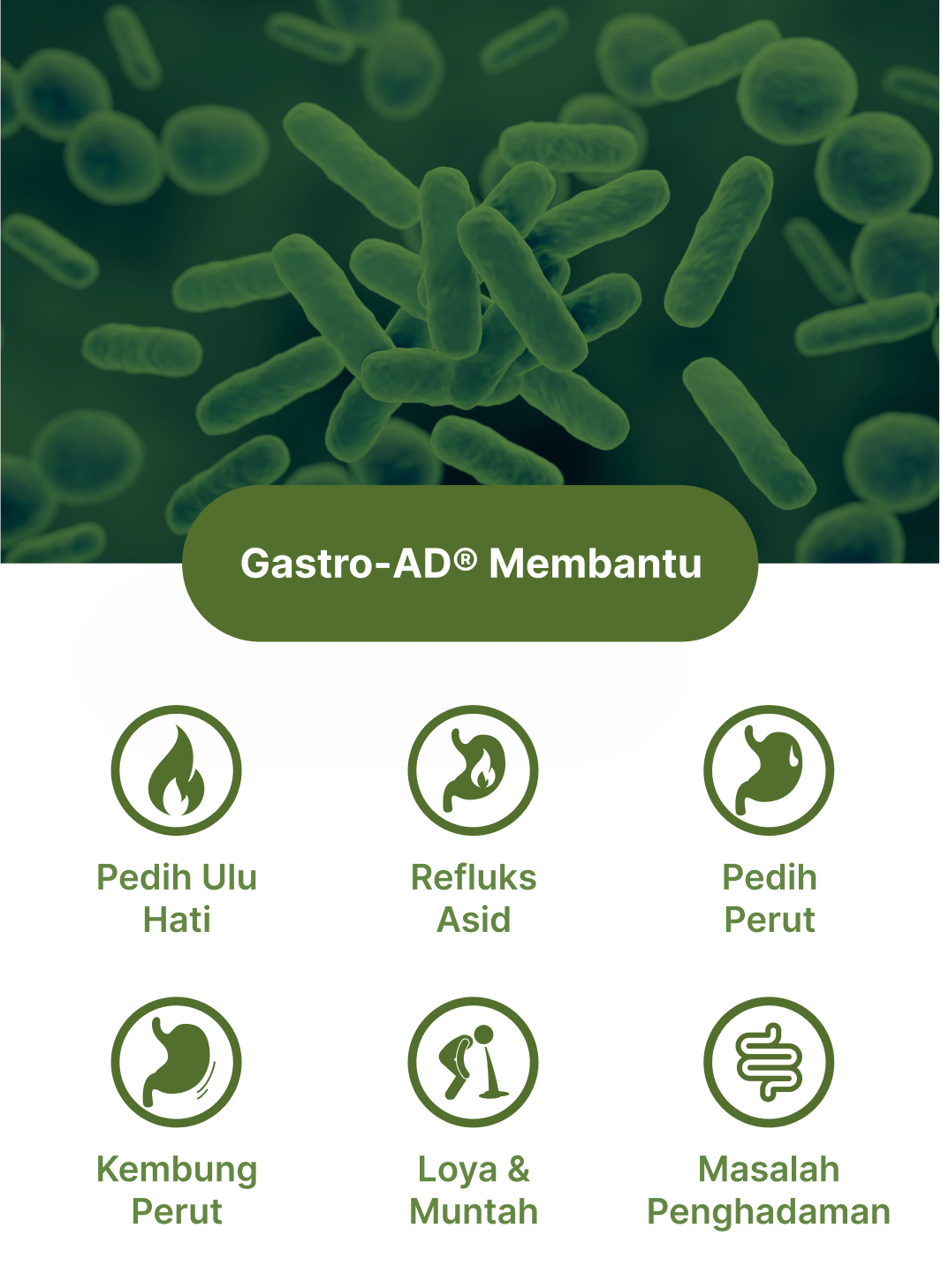 GASTRO-AD® ADALAH HASIL KAJIAN PAKAR GASTROLOGI TERKEMUKA DI DUNIA SEJAK 1950 YANG KHUSUS DALAM MERAWAT DAN MENYEMBUHKAN GERD, ANGIN & GASTRIK