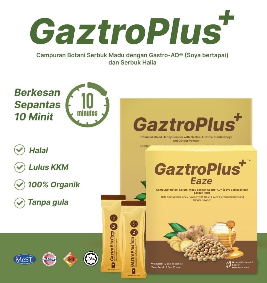 Gaztroplus adalah supplemen yang diformulasikan dari Gastro-AD®(berasaskan soya asli bukan GMO yang diperam dengan Probiotik), Madu & Pudina yang berfungsi secara efektif dalam menangani masalah GERD, Gastrik dan angin dalam badan. Kandungan ini membantu dengan pantas mengurangkan simptom seperti pedih ulu hati, serangan gastrik, sesak nafas, rasa nak muntah serta mempercepatkan proses penyembuhan.Gaztroplus alternatif semulajadi, selamat, dan terbukti berkesan berbanding ubat-ubatan.